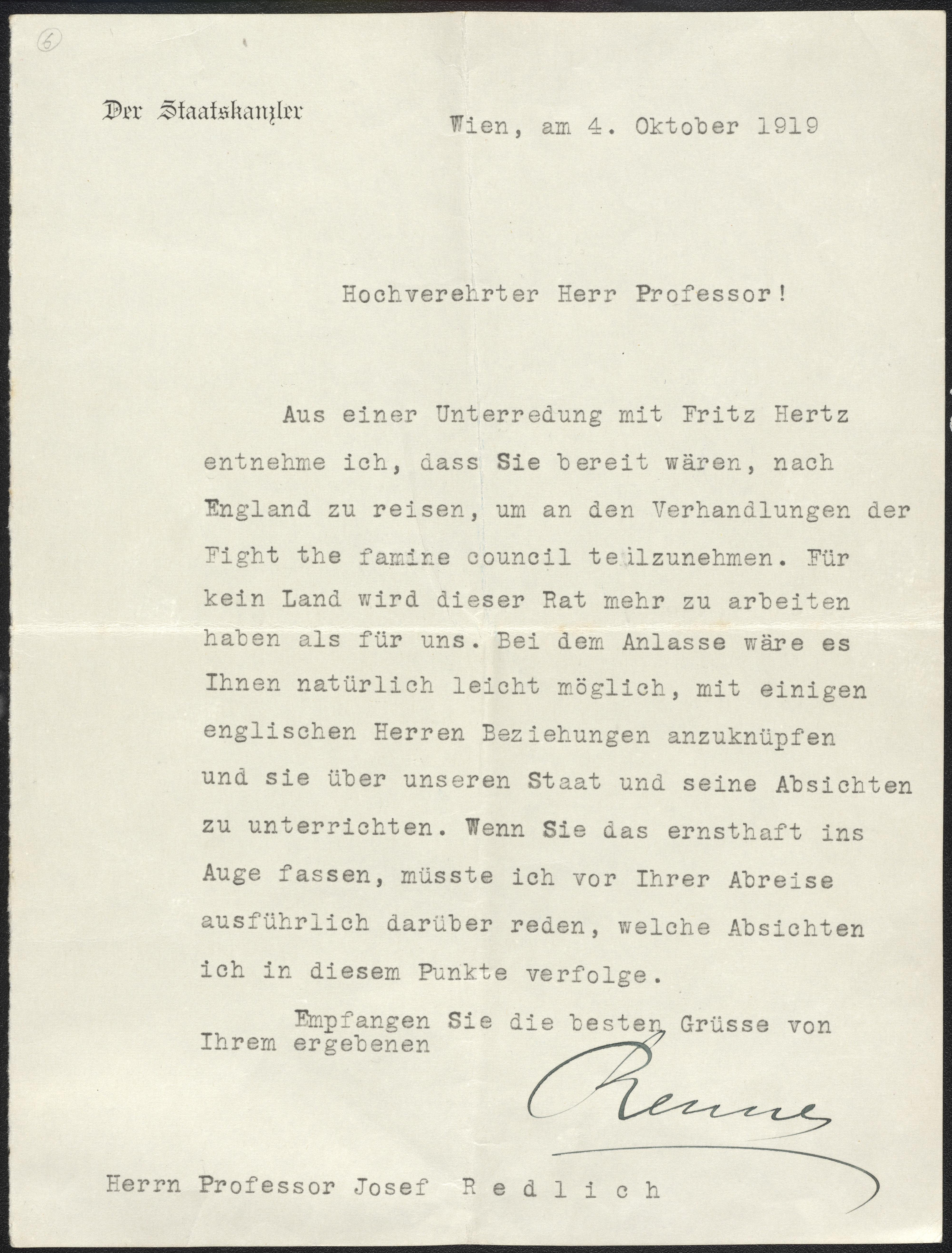 Pressefoto 2: Brief von Karl Renner an Josef Redlich vom 4. 10. 1919