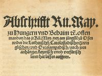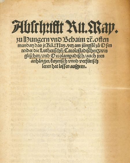 Abschrifft Ku.May. zu Hungern vnd Behaim [et]c. offen mandatz das jr Kü.May. yetz am jüngstẽ zů Ofen wider die Lutherischñ / Carolostadischen Zwinglischen / vnd Oecolampadisch / auch jren anhänger / ketzerisch vnnd verfürisch leren hat lassen ausgeen[Geben in vnser Küniglichen statt Ofen / am xxij. tag des Monats Augusti / im Fünfftzehenhunderten vñ Sibenundzwaintzigisten Vnserer Reiche im Ersten jaren]. - [Landshut] : [Johann Weißenburger], [1527]