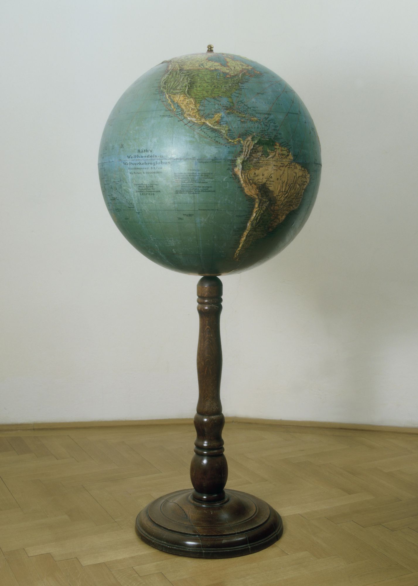 Auf diesem so genannten Themaglobus aus dem 20. Jahrhundert stehen nicht topographische Sachverhalte im Mittelpunkt, sondern Informationen zu Welthandel und wichtigen Verkehrsrouten. Darüber hinaus ist das Oberflächenprofil der Erde dreidimensional auf die Globuskugel aufmodelliert.