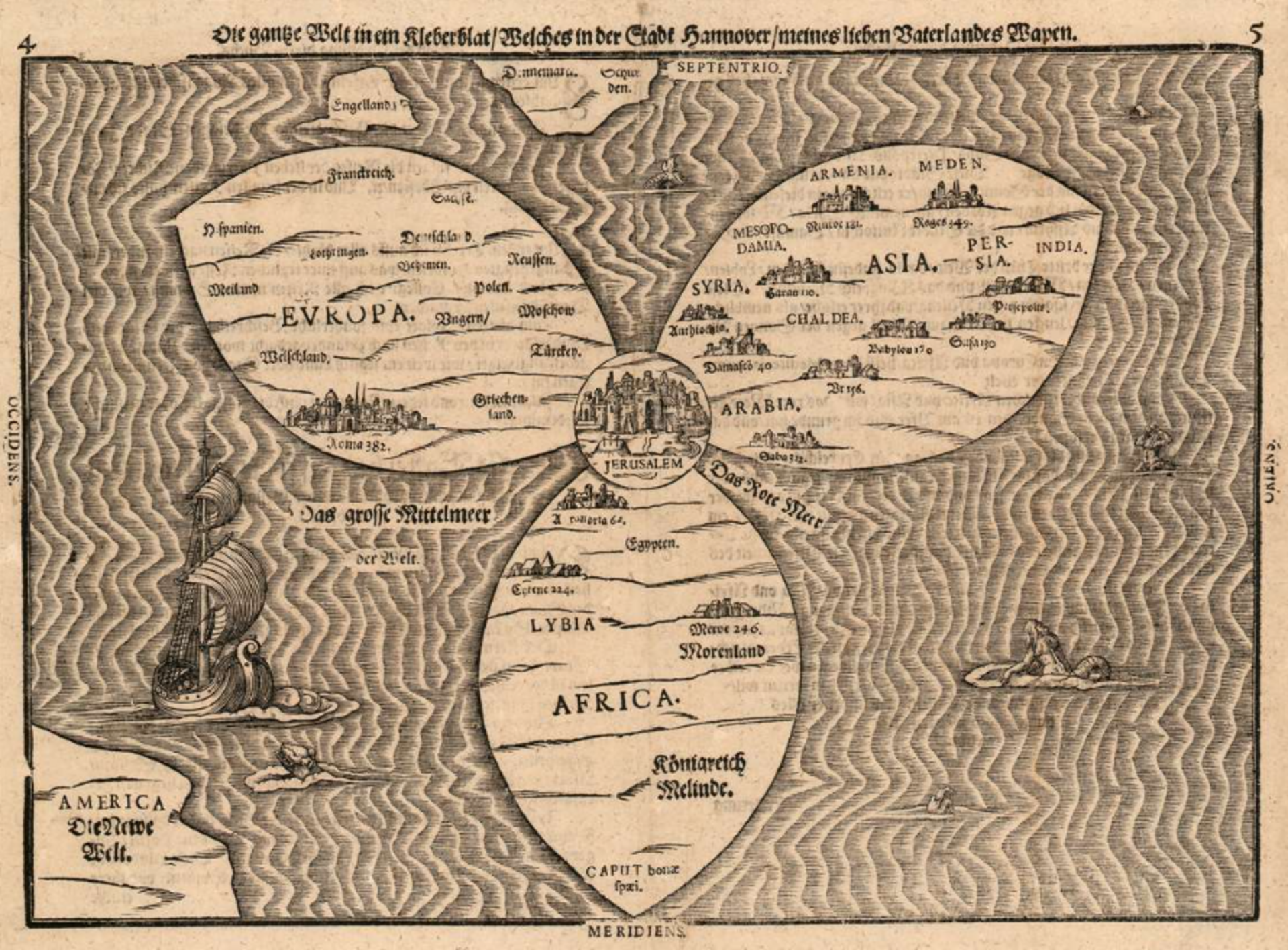Betitelt mit „Die gantze Welt in ein Kleberblatt Welches ist der Stadt Hannover meines lieben Vaterlandes Wap[p]en“ ist diese Karte auch eine Hommage an Büntings Geburtsstadt Hannover, die im Wappen das Dreiblatt führt. Die Abbildung zeigt in der Tradition mittelalterlicher Weltkarten Jerusalem im Zentrum, davon ausgehend Europa, Asien und Afrika in der Kontur der Blätter, während die neue Welt im unteren linken Eck angedeutet wird.