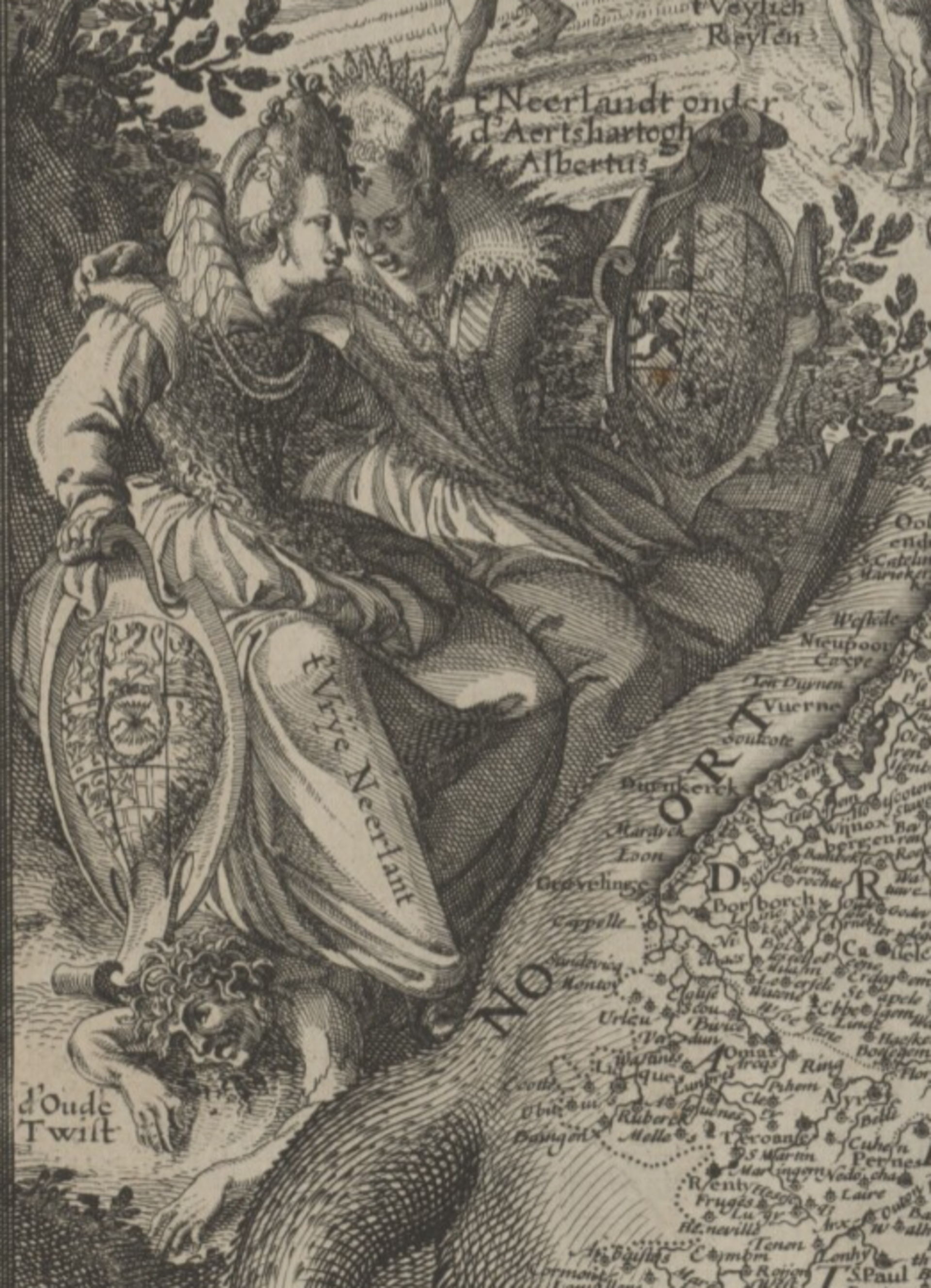 Zu Füßen zweier Frauen liegt in Form einer leblosen Figur der alte Zwist („d’Oude Twist“). Die beiden einander zugeneigten weiblichen Gestalten werden als die freien Niederlande („t’Vrije Neerlant“) und die Niederlande unter Erzherzog Albrecht VII., dem habsburgischen Regenten seit 1598 („t’Neerlandt onder d’Aertshartogh Albertus“) bezeichnet. Damit weist der Verleger aus den nördlichen Niederlanden auf die Realität der Teilung hin. Auch die Randveduten spiegeln diese Realität wider: rechts beginnend mit Antwerpen jene der Südlichen Niederlande und links die der Vereinigten Provinzen mit Amsterdam ganz oben. Dennoch symbolisiert der Löwe neben Kraft und Macht auch die (ehemalige) politische Einheit aller Provinzen.
