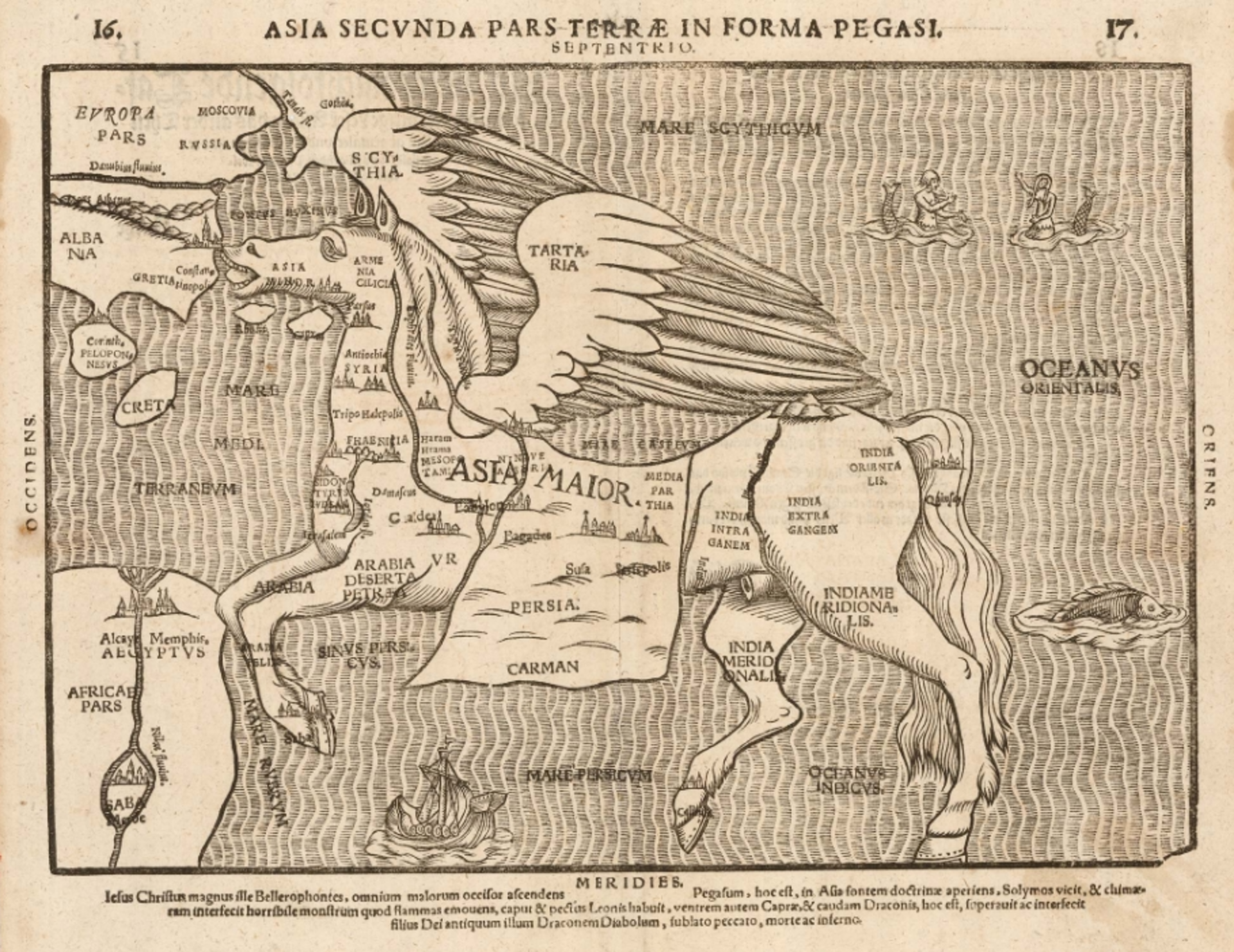 Der nach Westen blickende Kopf des Pegasus wurde in die Umrisse von Kleinasien gezeichnet. Der Nahe Osten bildet Brust und Vorderbeine, Persien den mittleren Teil und das mit Indien beschriftete Süd- und Südostasien Kruppe und Hinterbeine. Auf den beiden Flügeln ist Scythia und Tartaria zu lesen.